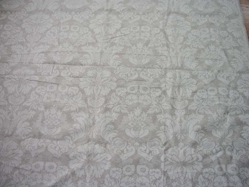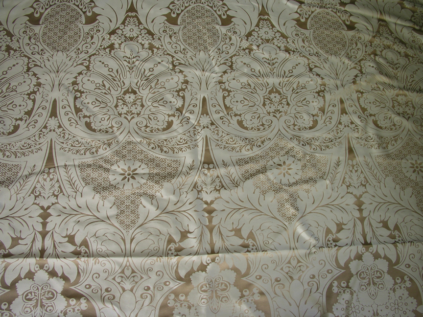 Heavy silk damask White Silk 4 yards 31" @ 54 1/2"wide Already machine washed (on hot - has shrunk a couple of inches from the original 5 yards) and dried, dyes beautifully - the photo of the gold damask Click here is to show the pattern since it is difficult to photograph the white |