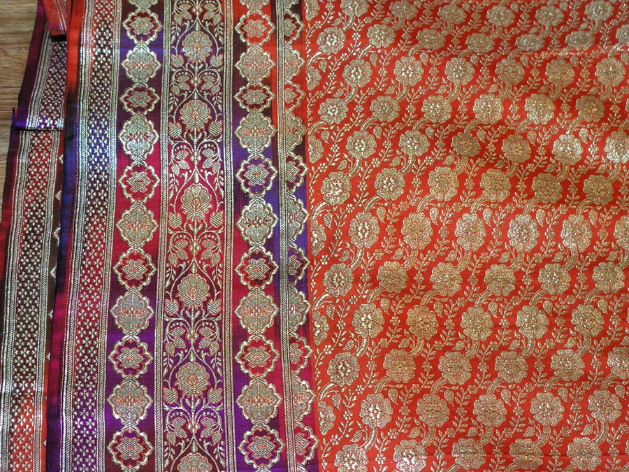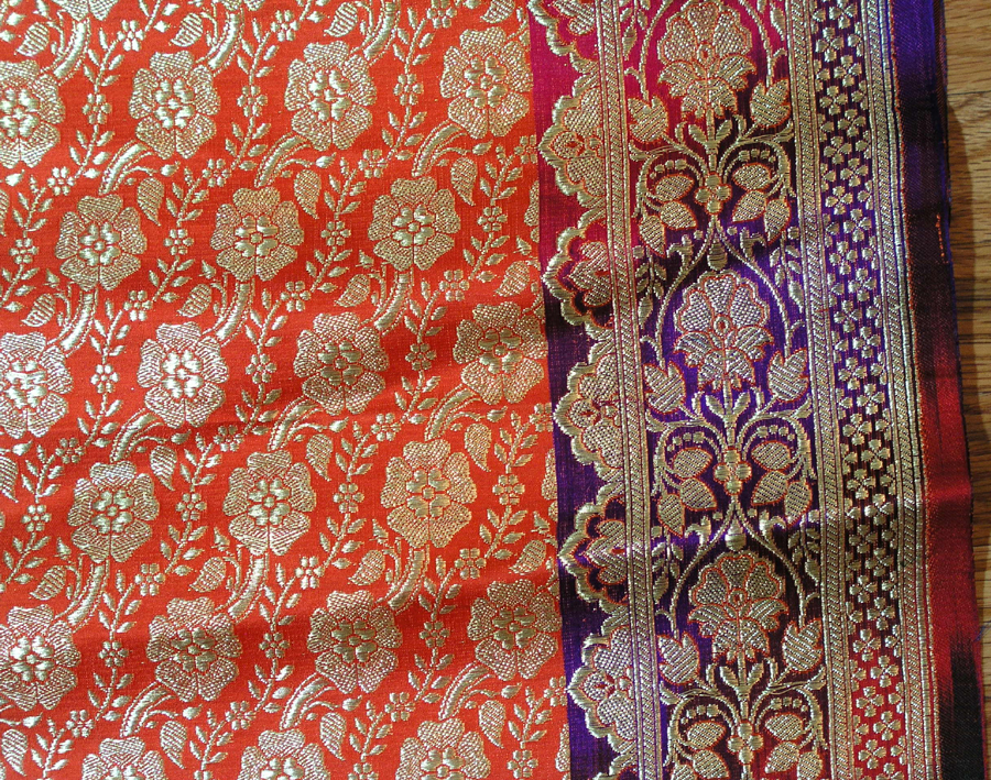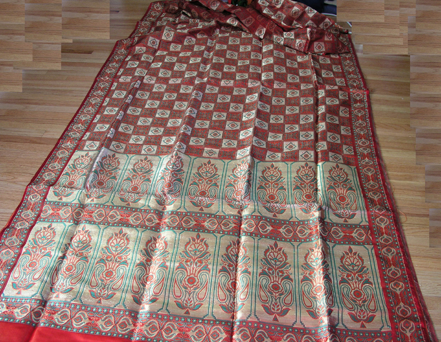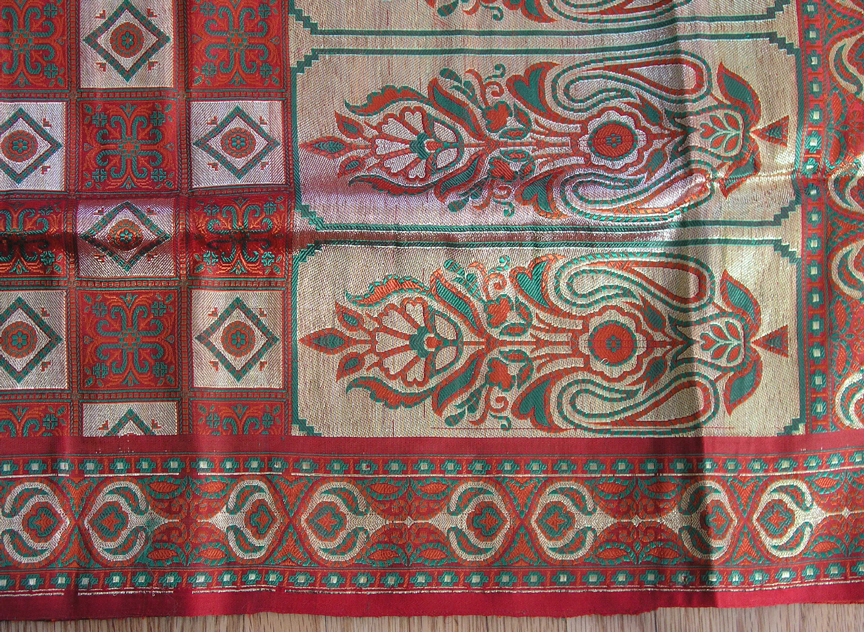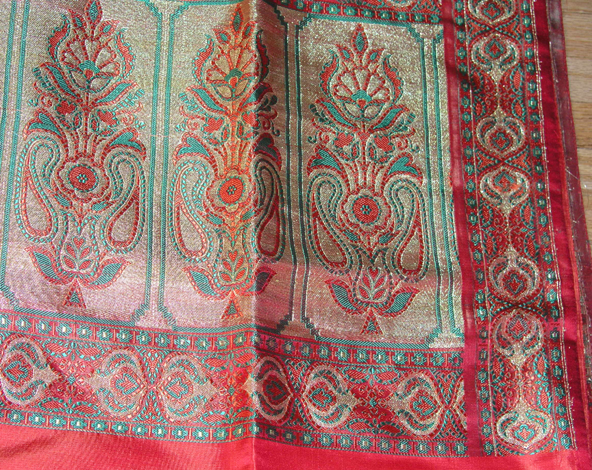 Square Brocade Sari. Red, orange, green, metallic gold. Silk & metallic fiber. 6 yards 11" @ 44" wide Extra long and wide. Brocaded completely end to end, full top and bottom borders, only choli piece is plain red satin with a border edge, only fault is one area on head piece where gold has faded to silver Close-up of headpiece Headpiece end Close-up of body pattern Faded Spot |