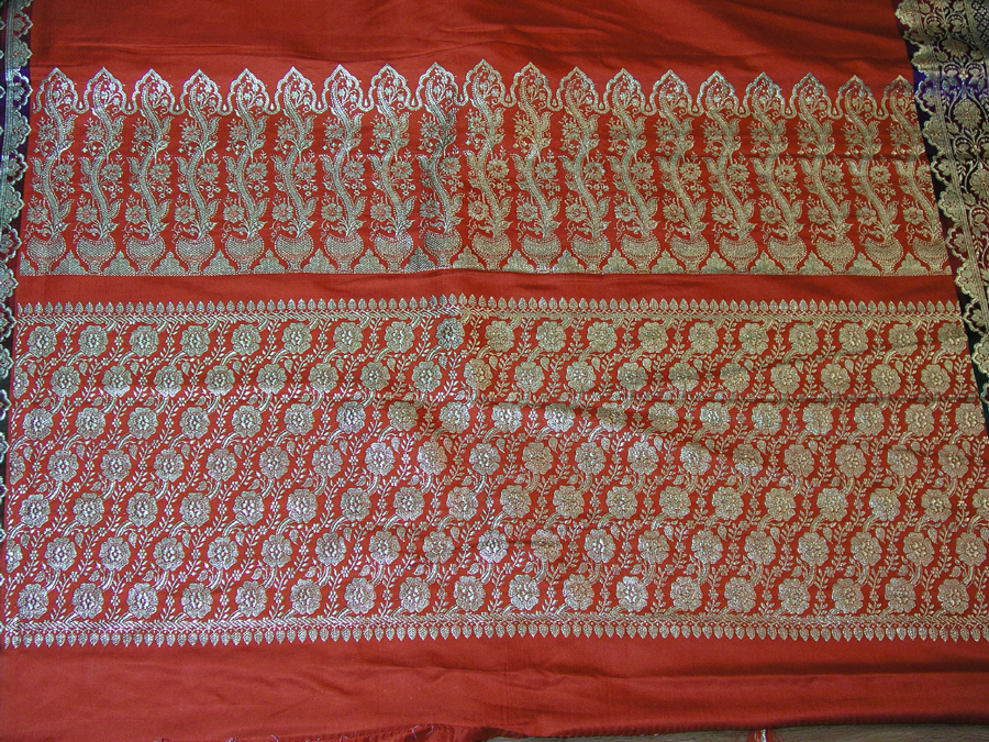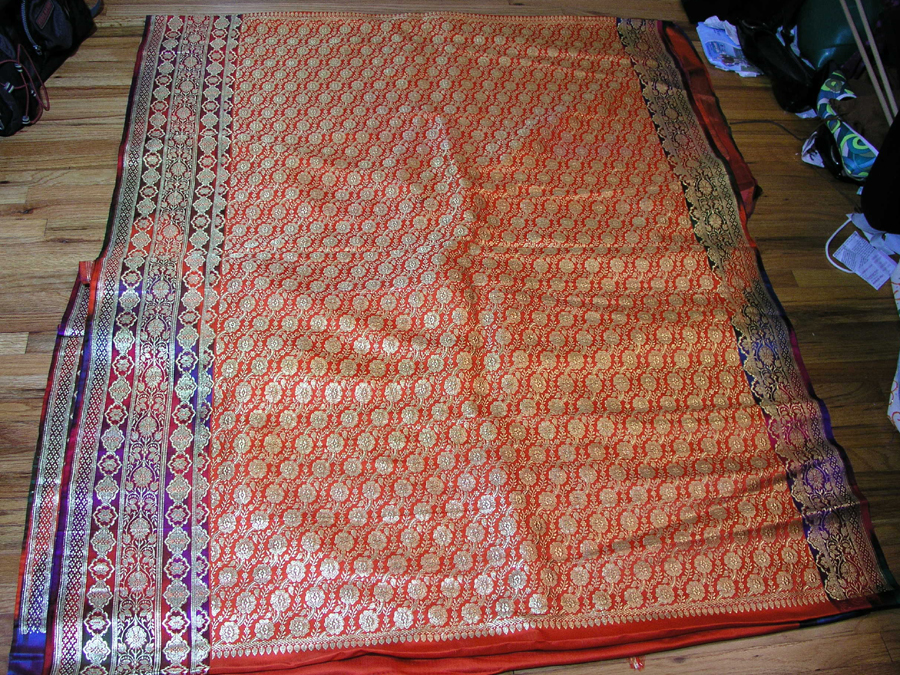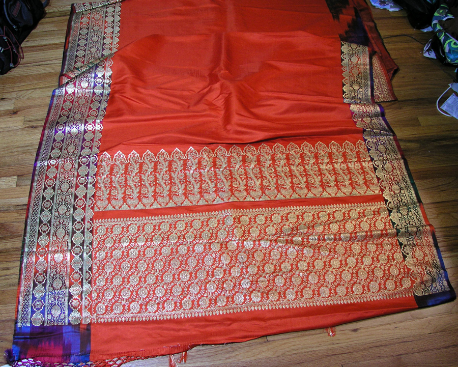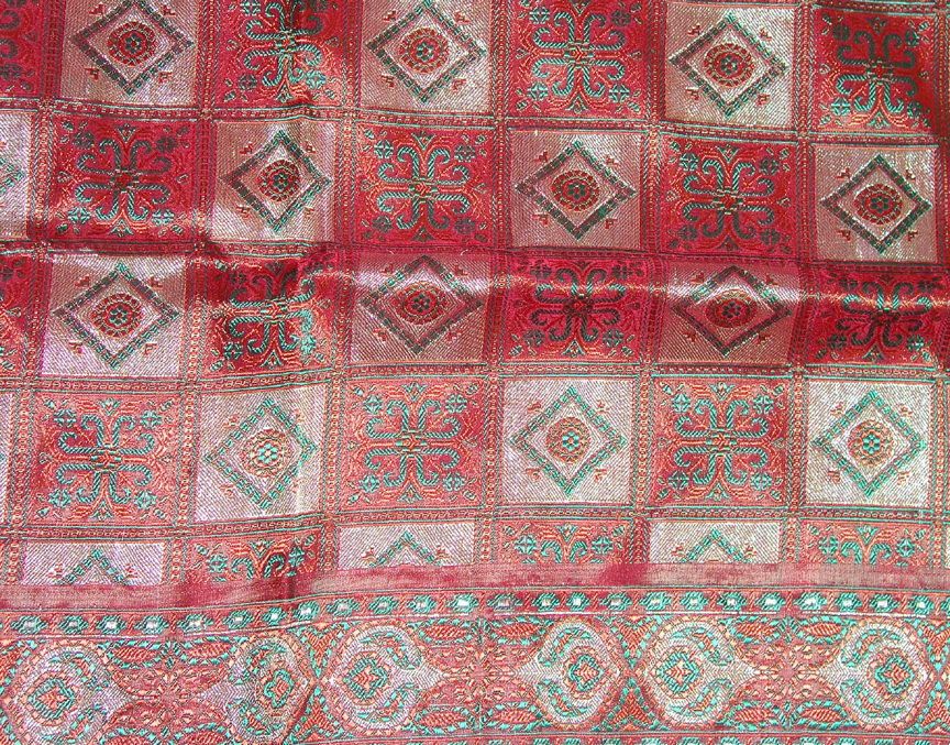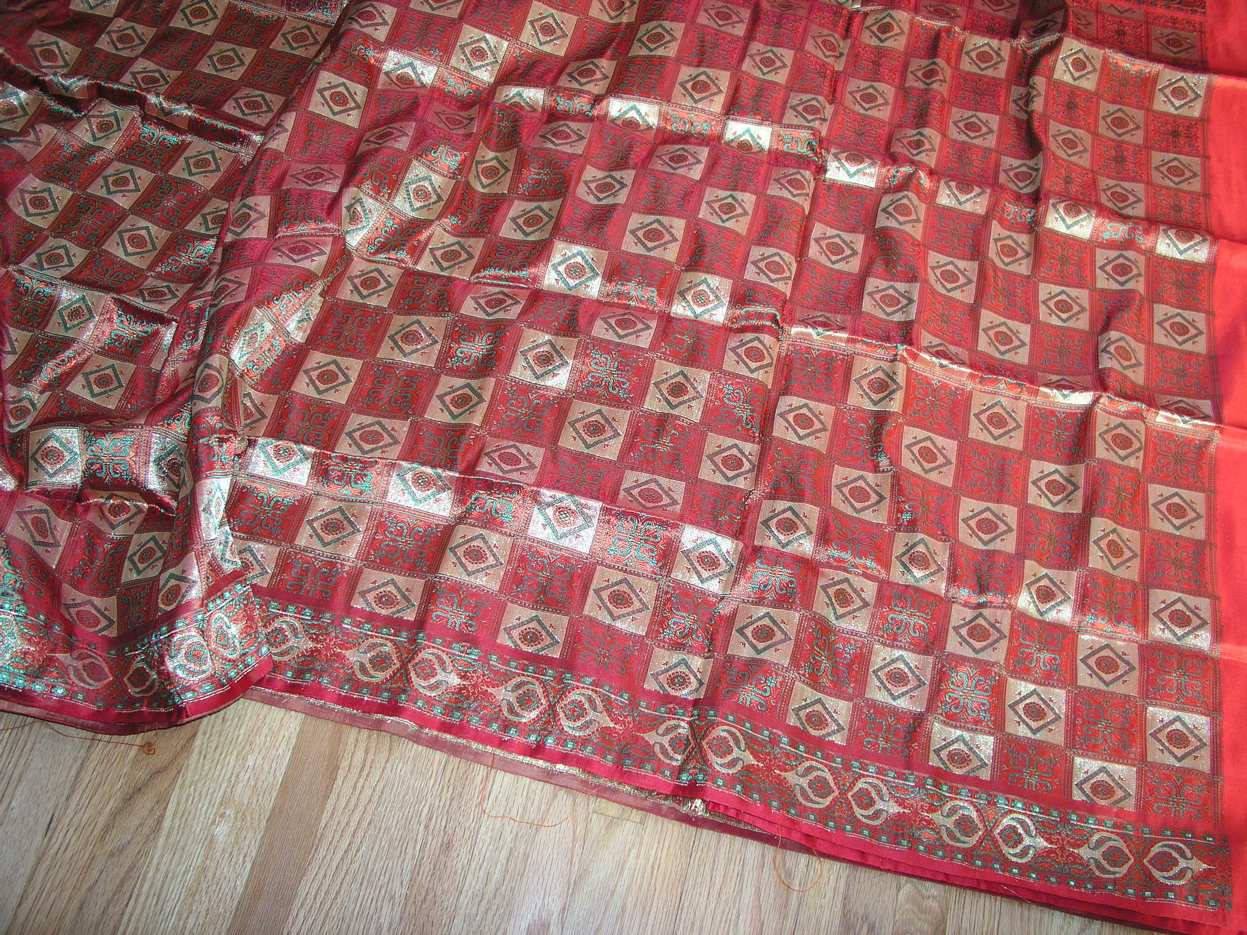 Square Brocade Sari. Red, orange, green, metallic gold. Silk & metallic fiber. 6 yards 11" @ 44" wide Extra long and wide. Brocaded completely end to end, full top and bottom borders, only choli piece is plain red satin with a border edge, only fault is one area on head piece where gold has faded to silver Close-up of headpiece Headpiece end Close-up of body pattern Faded Spot |