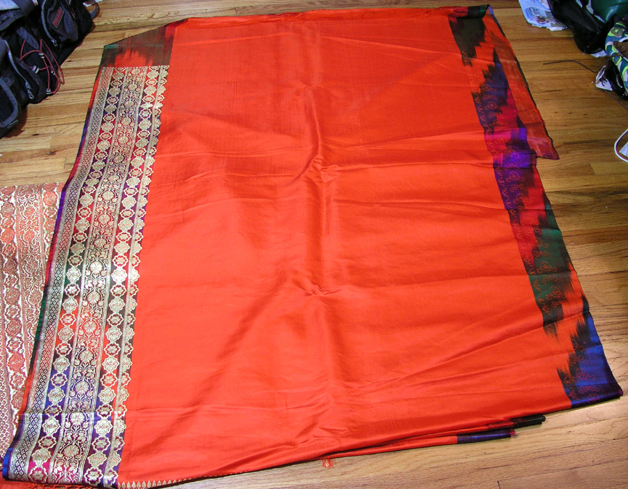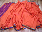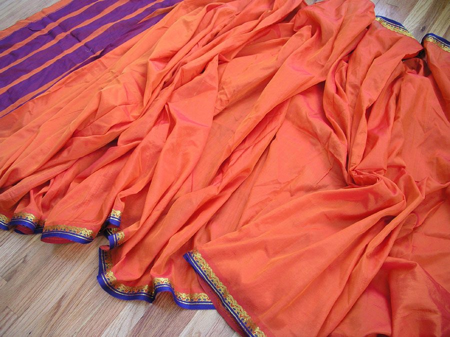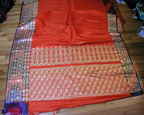 Satin Sari. Vermillion Orange Silk. Scotch guarded, choli piece is sewn on,large brocade panel Close up of top border. Close up of bottom border. Close up of body. Plain body section. Plain pattern section. |