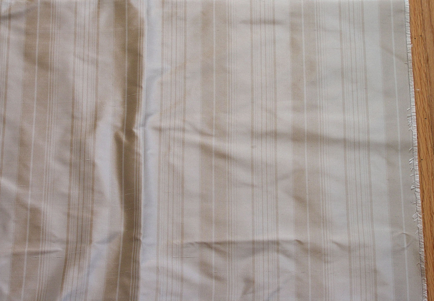 Striped shantung. Beige and tan silk. 2 3/4 yards @ 54" wide. Very few slubs with the stripes running parallel to the selvedge. |