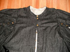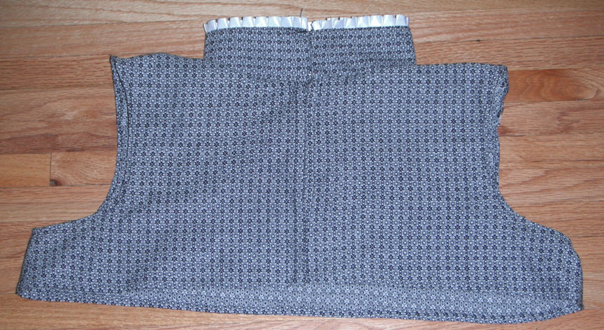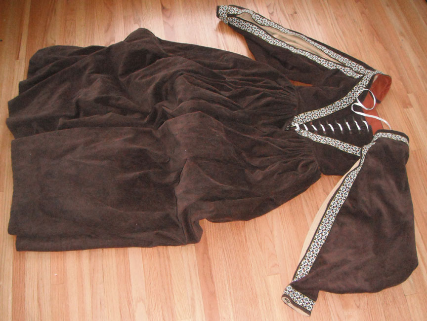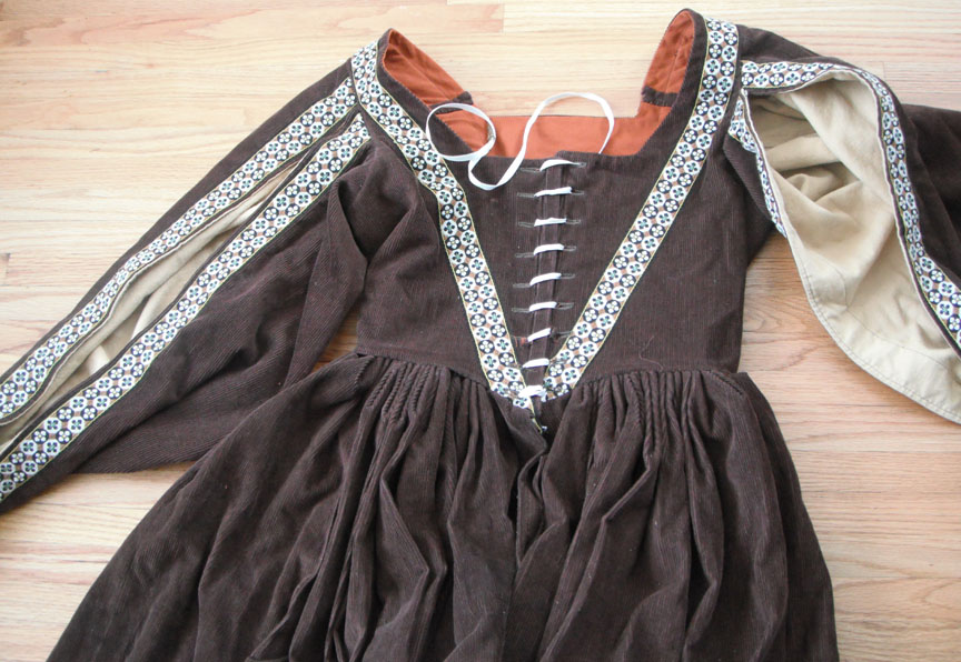 made of a chocolate brown cotton corduroy with a lovely 1 ˝ inch wide patterned trim on the sleeves and bodice.