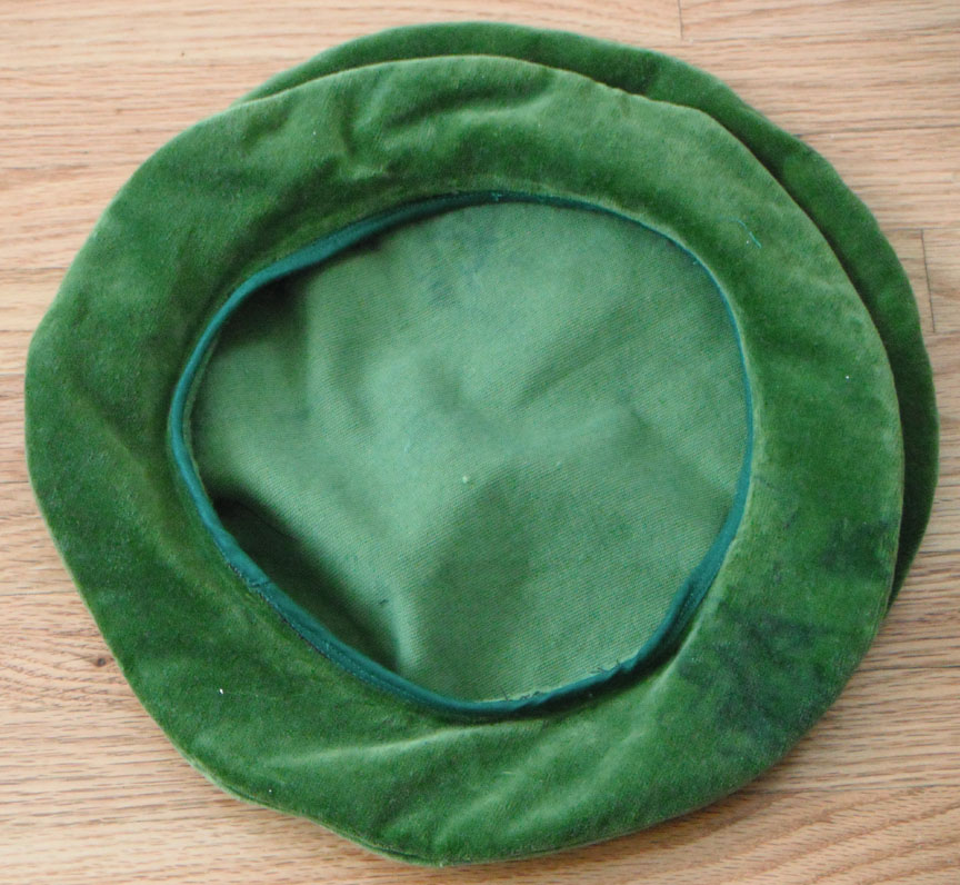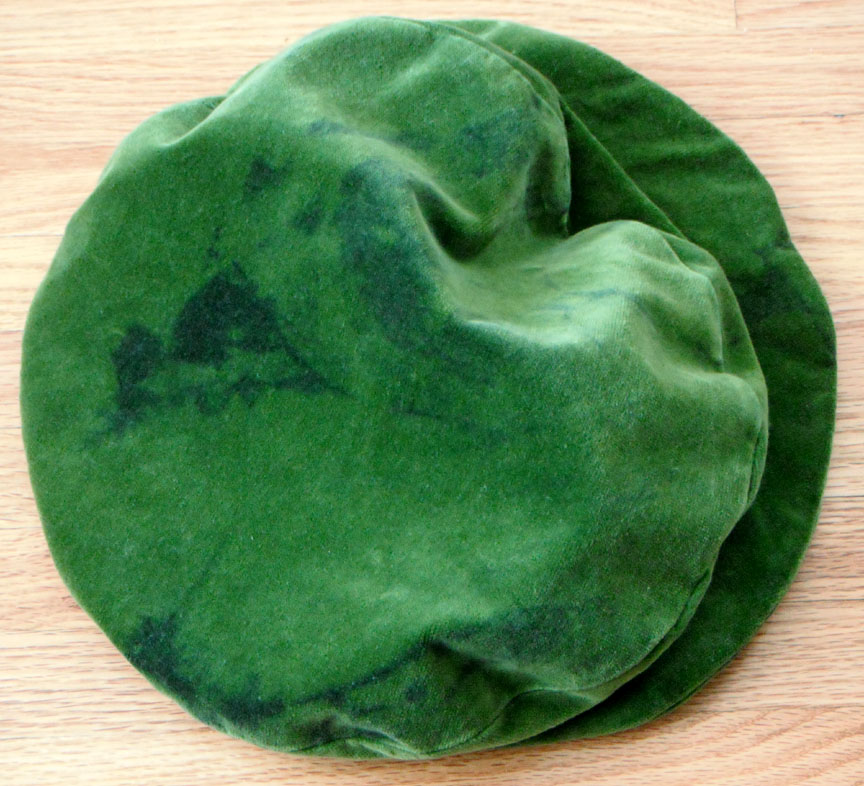 Green cotton velvet Flat-cap. Machine washed and dried. It does have an uneven dye job as noted in the pictures.