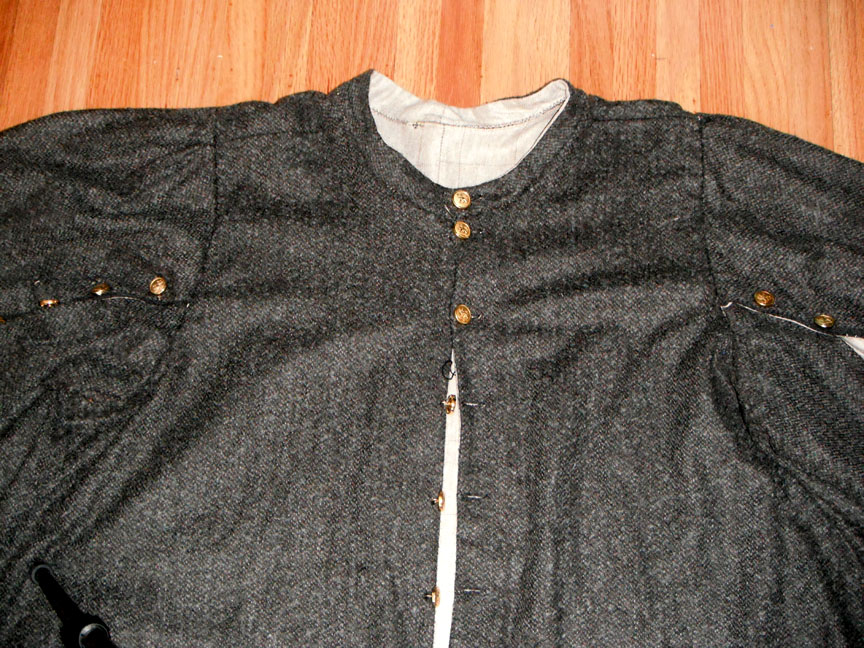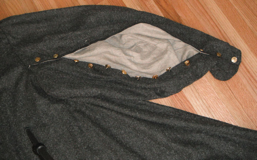 cream coloured silk/wool blend and fastened down the front and the length of the hanging sleeves with
